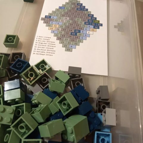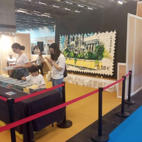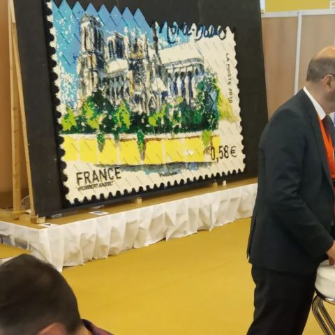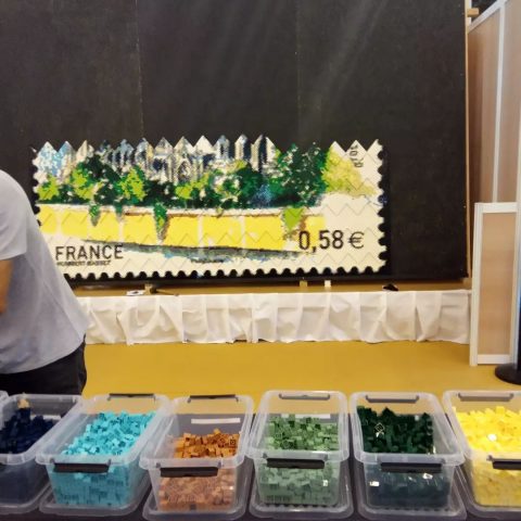 Un timbre à moi! Je découvre éberlué, au Salon Paris Philex, que l’association Briques en folie est en train de reconstituer avec l’aide des volontaires, le timbre « Notre Dame » que j’avais réalisé en 2010. Avec plus de 40000 briques de Lego. Scotché. Et je m’y suis collé en réalisant avec joie mon losange de Lego. Au fil de la journée, cette immense reproduction  d’un des tout premiers timbres que j’ai réalisé prend forme. Initiative incroyable de Philaposte et des organisateurs de Parisphilex 2022. Réalisation : Les Briques en Folie, Rouen.