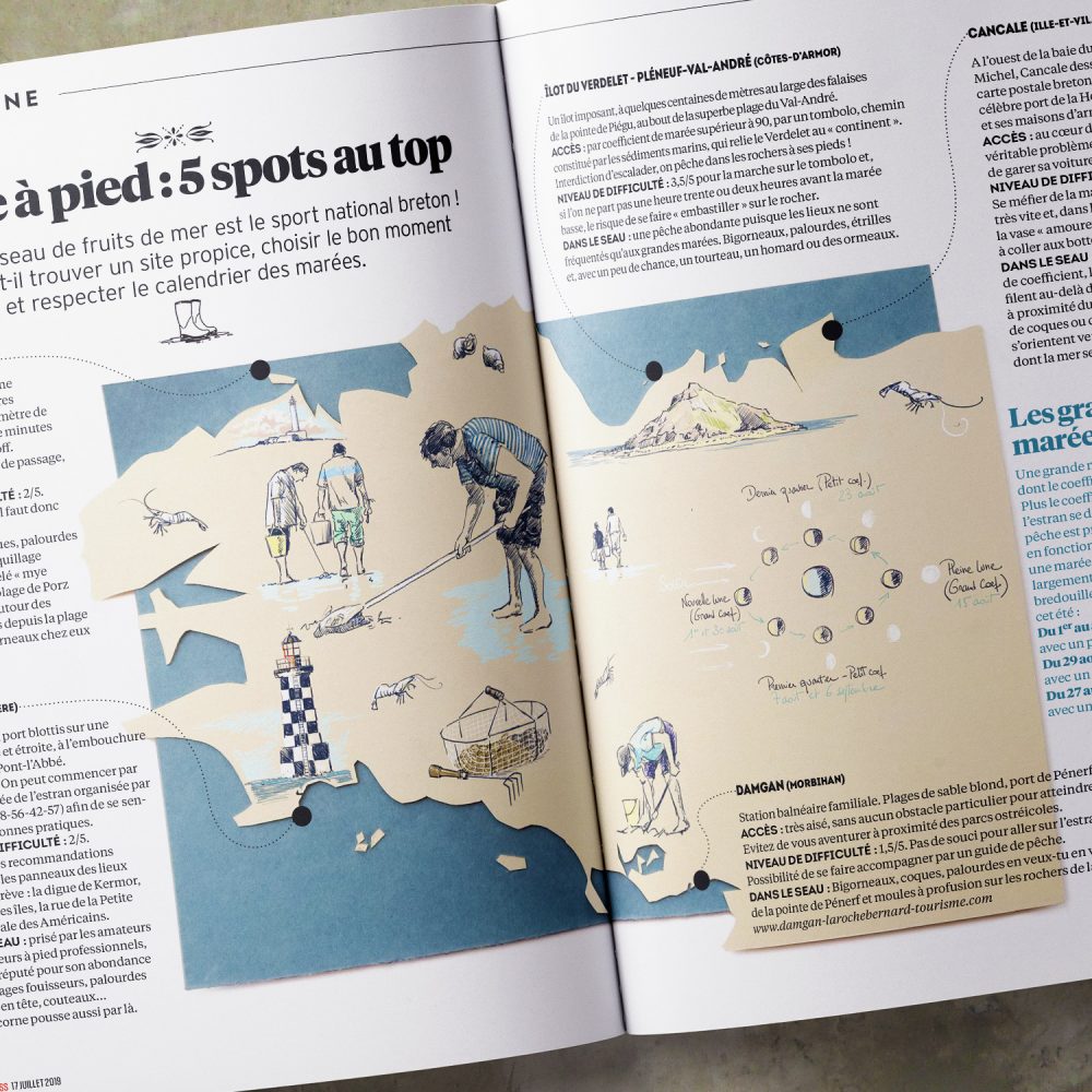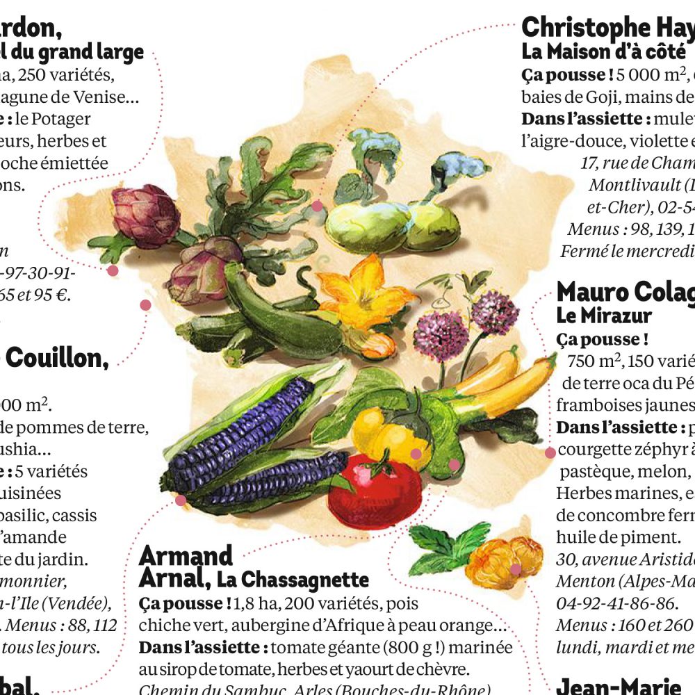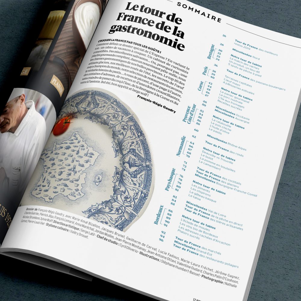 Cahier spécial « Le tour de France de l’été gourmand » de L’Express.Tout ça est signé François Gaudry, certes, mais les illustrations, c’est moi qui m’y colle. Une soixantaine des cartes, plats et portraits, mais également de fausses plaques émaillées, des natures mortes et un tas d’autres choses.